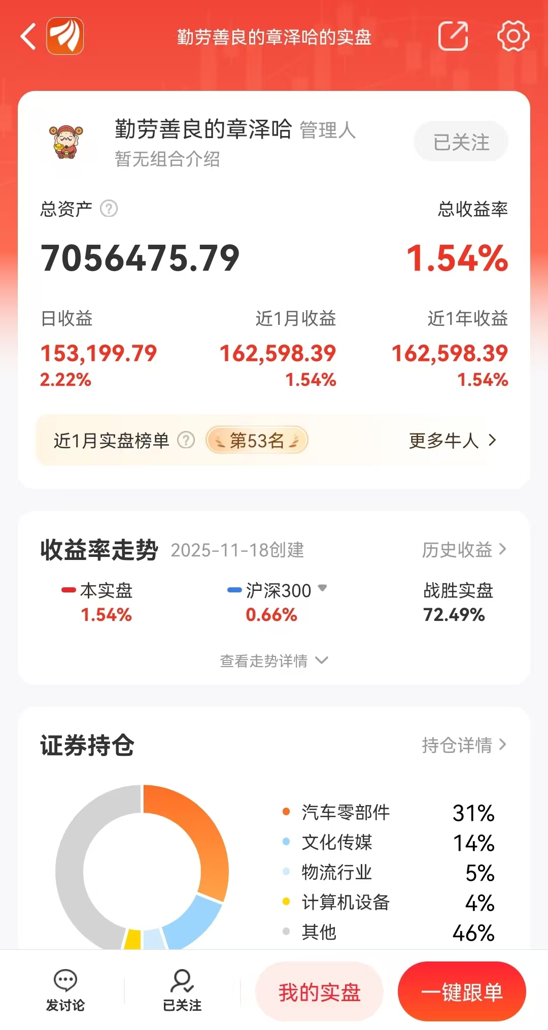 炒股战绩:近1月收益额榜第53名