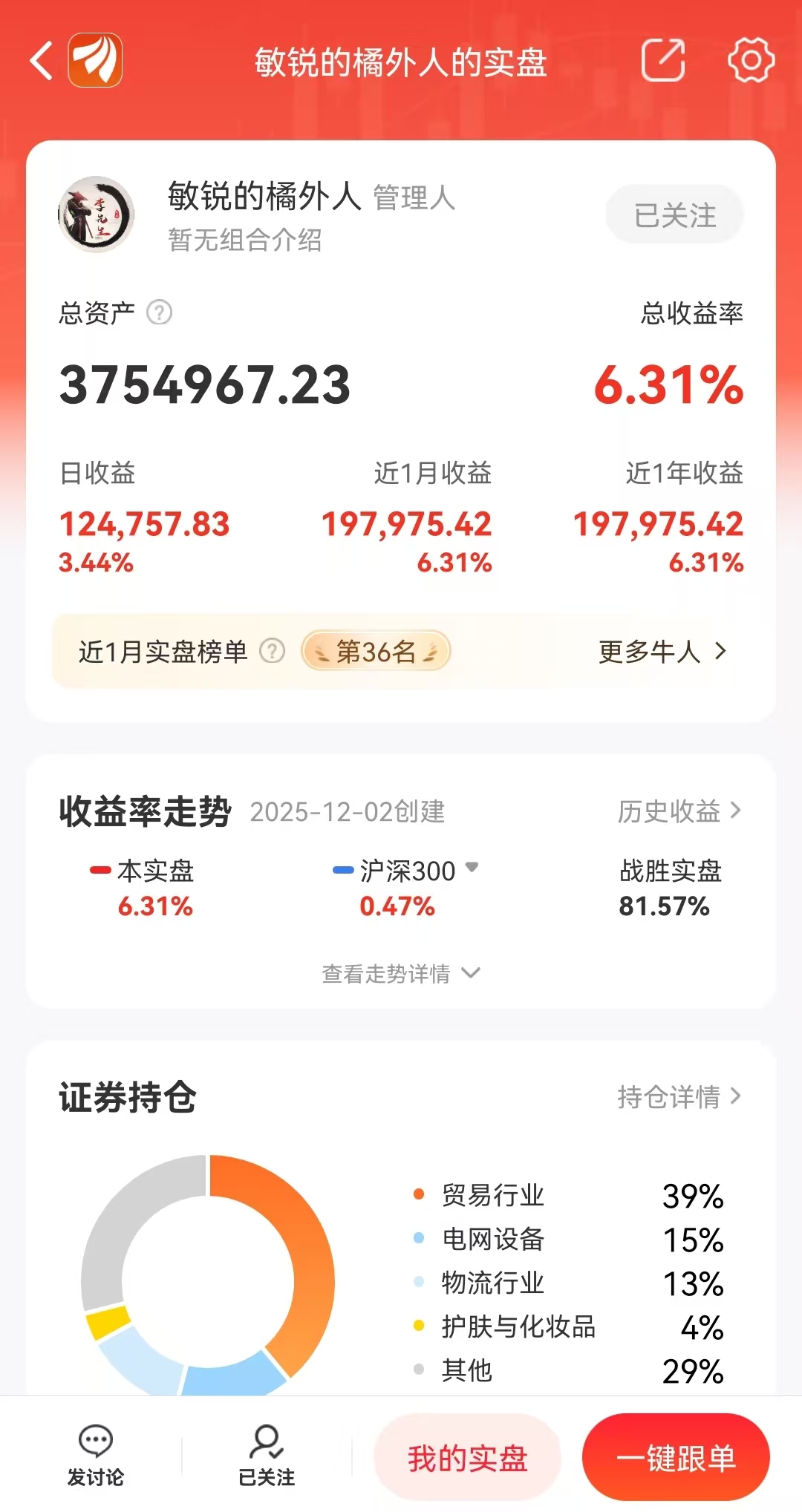 持仓思路:贸易行业39%+电网设备15%+物流行业13%+护肤与化妆品4%