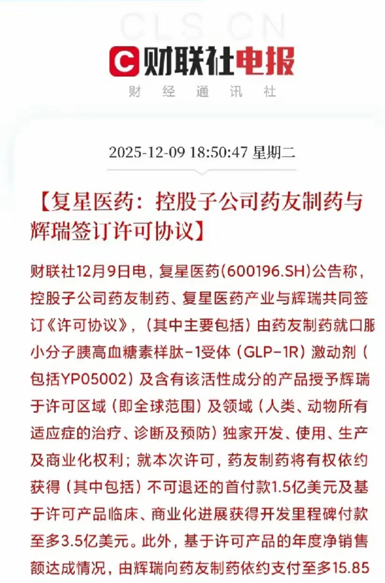 复星医药公告,控股子公司药友制药与辉瑞签署《许可协议》,将自研口服小分子GLP-1受体激动剂独家授权辉瑞进行全球开发与销售;复星将获1.5亿美元首付款,叠加里程碑付款总计最高约20.85亿美元。
