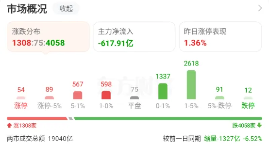今天大盘两市成交总额1.9万多亿,缩量1300多亿,红盘1300多家,盈利效应较差。