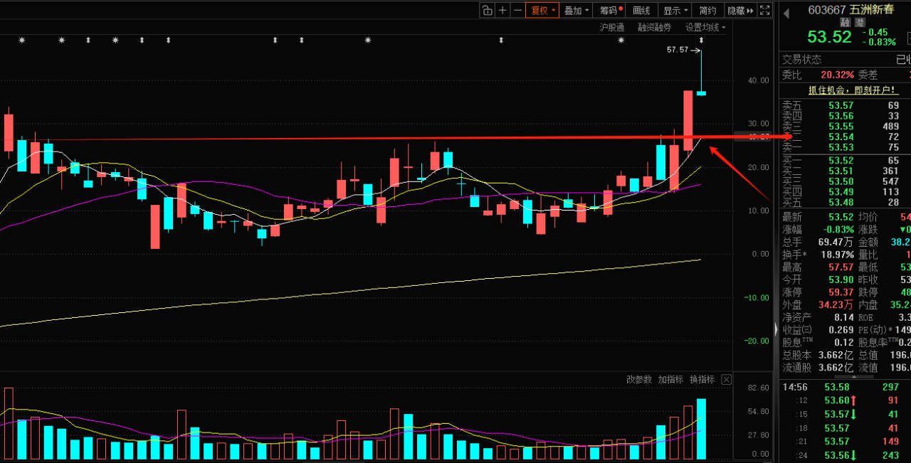 五洲新春603667:商业航天,昨天出现冲高回落长上影线,不是很好看,但是昨天早上是有量的,只不过分时出现了小级别量价背离而已,短期有两种情况,一种是乐观的,今天直接小高开或者平开,然后冲高修复,一种是直接回踩5均然后收回来做一个下影线,形成揉搓,不论哪一种,这里只要5均不破,趋势就还在,福建板块基本没有差的。