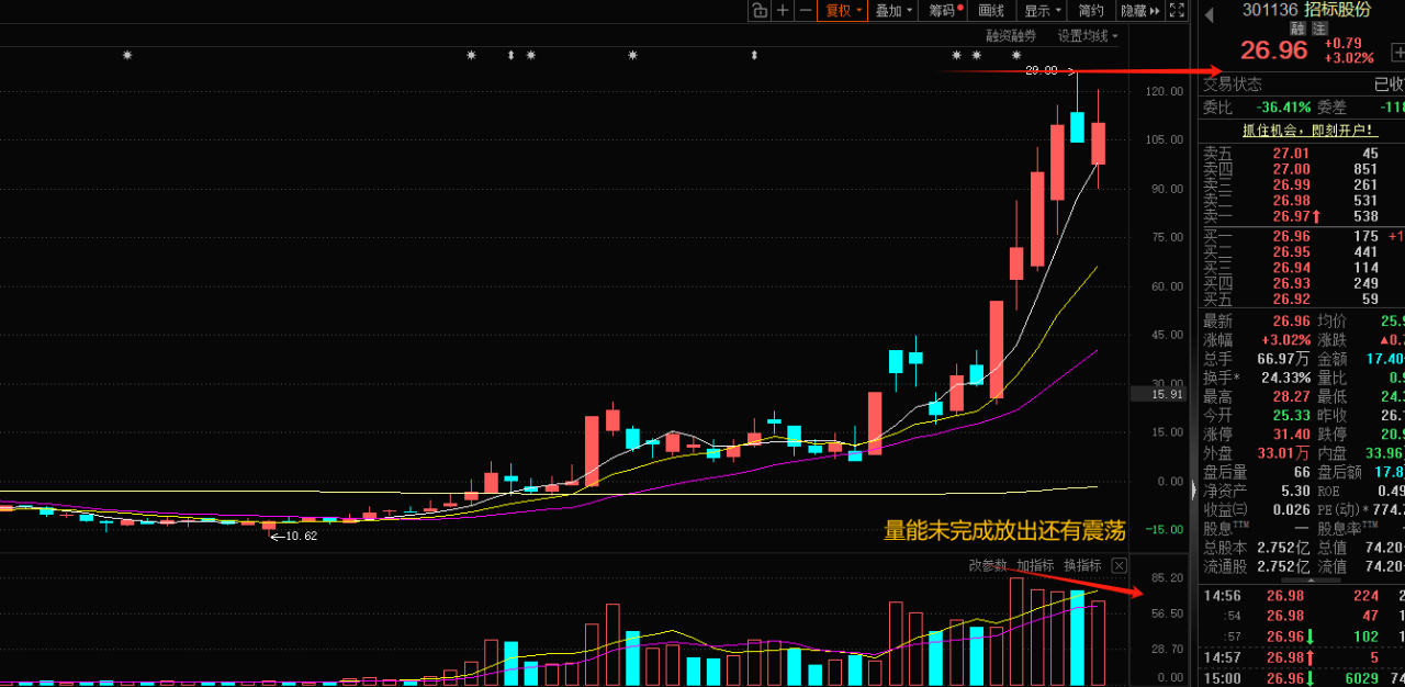 招标股份301136:商业航天概念,由于昨天拉升没有反包掉前面的阴线,所以今天仍然存在冲高回落或者低开冲高这两种可能,如果29这个位置不能放量过去,那么短期就是滞张要撤了。