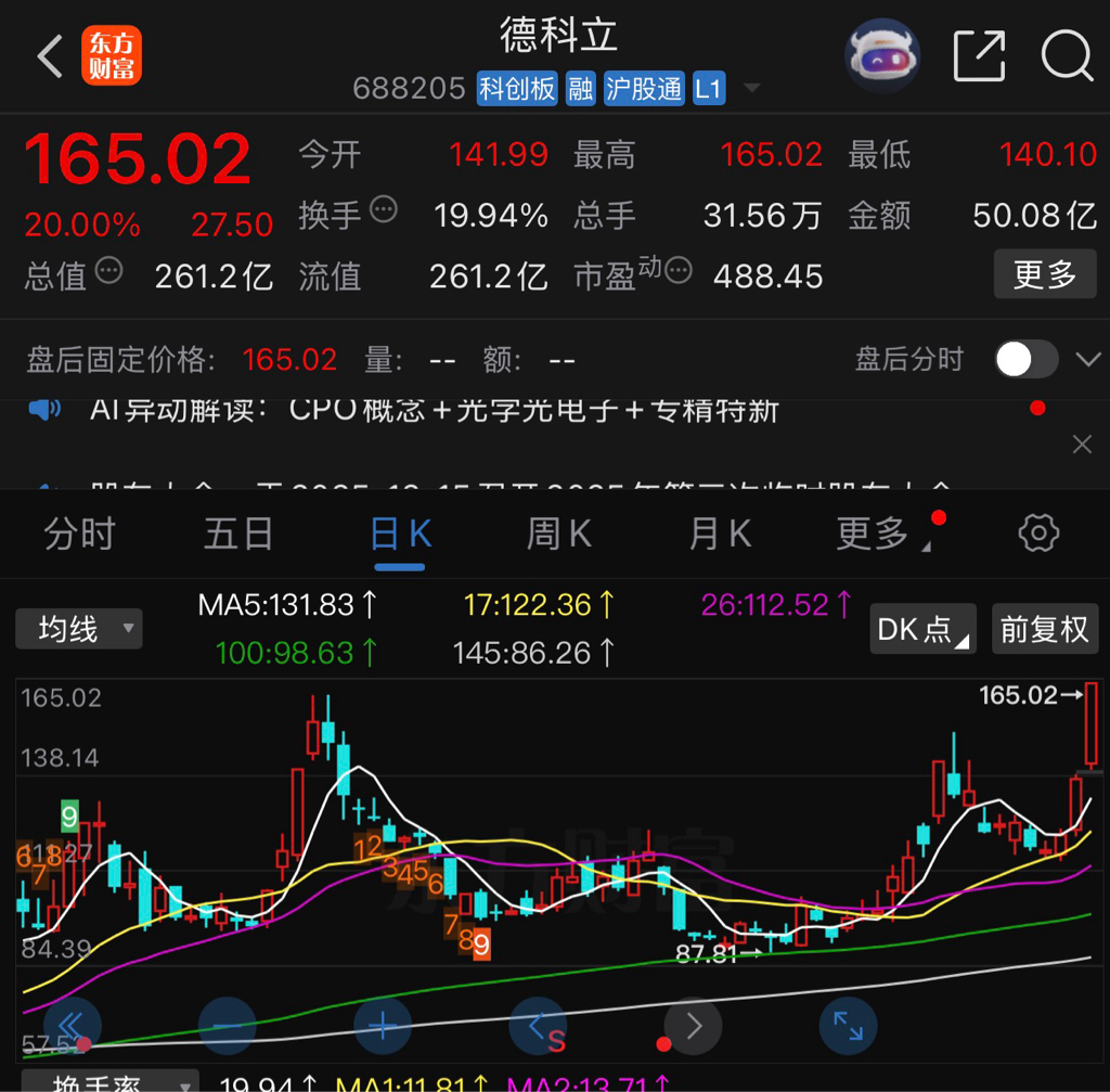 后续我觉得得盯住公司的公告,会不会有什么意想不到的订单或者利好呢?明天会不会继续一字或者二板呢,得多关注一下。另外一只被爆拉20cm的CPO概念的$德科立(SH688205)$ 也尤为耀眼,盘中一路震荡拉升,并且封住了涨停。从盘后龙虎榜来看,都是机构和外资的大手笔买入。我觉得如此的抢筹,肯定后续还会有高度,所以值得我们多去看一眼。
