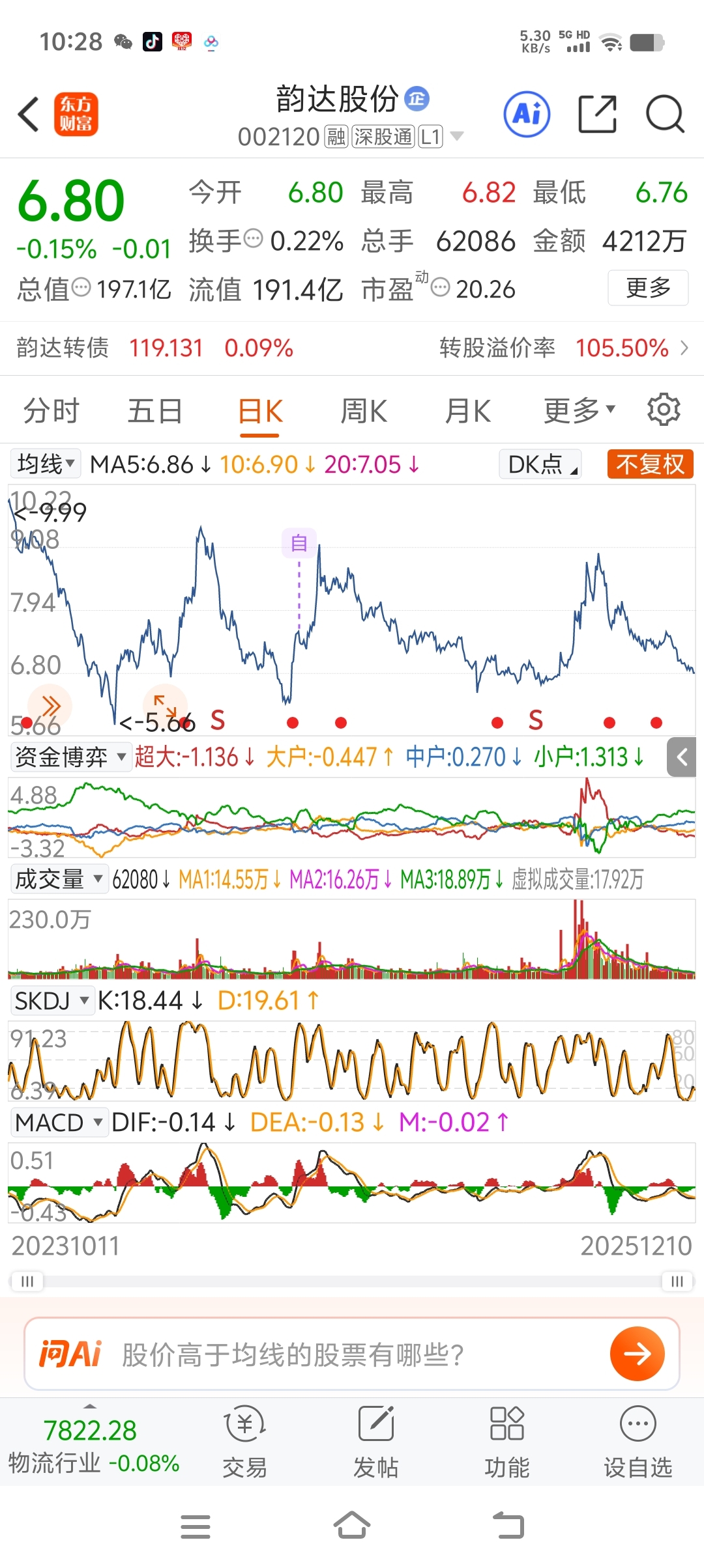 从2023年10月低点到2024年5月高点,韵达这一段涨幅的61.8%黄金分割位就在6.1元附近。
