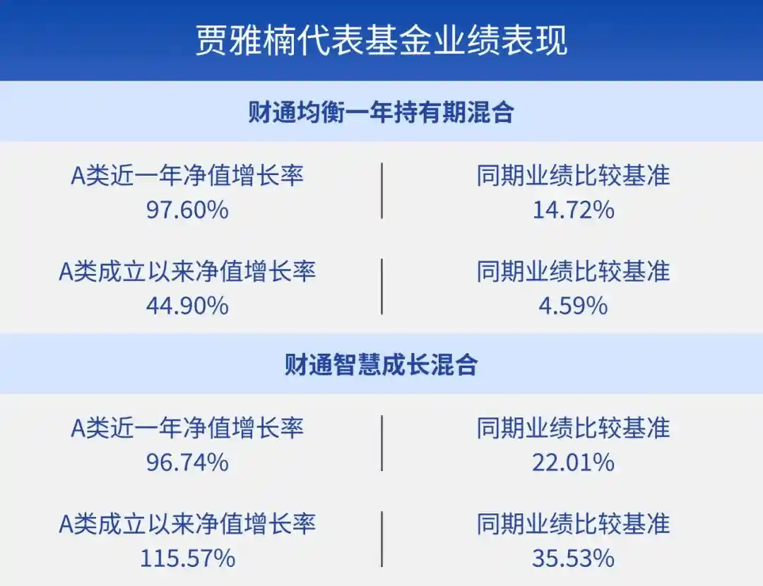 [2] 净值增长率来自财通基金产品定期报告,财通均衡一年持有期混合成立于2021年11月24日,贾雅楠自2024年10月21日开始任职基金经理;A类从2021.11.24到2024.12.31期间,完整会计年度收益率(同期业绩比较基准)为-18.13%(-13.17%)、-17.14%(-8.10%)、24.88%(13.99%);C类从2021.11.24到2024.12.31期间,完整会计年度收益率(同期业绩比较基准)为-18.79%(-13.17%)、-17.81%(-8.10%)、23.89%(13.99%);截至2025.09.30,A类基金净值增长率(同期业绩比较基准)成立以来44.90%(4.59%),近三年76.97%(25.63%),近一年97.60%(14.72%);截至2025.09.30,C类基金净值增长率(同期业绩比较基准)成立以来40.52%(4.59%),近三年72.78%(25.63%),近一年96.07%(14.72%);财通智慧成长混合成立于2020年4月3日,贾雅楠自2025年1月24日开始任职基金经理;A类从2020.4.3至2024.12.31期间,完整会计年度收益率(同期业绩比较基准)分别为21.20%(10.56%)、-12.39%(-14.42%)、-27.53%(-5.19%)、46.82%(6.96%);C类从2020.4.3至2024.12.31期间,完整会计年度收益率(同期业绩比较基准)分别为20.24%(10.56%)、-13.09%(-14.42%)、-28.10%(-5.19%)、45.65%(6.96%);截至2025.09.30,A类基金净值增长率(同期业绩比较基准)成立以来115.57%(35.53%),近五年92.25%(19.72%),近三年58.14%(26.15%),近一年96.74%(22.01%);截至2025.09.30,C类基金净值增长率(同期业绩比较基准)成立以来106.31%(35.53%),近五年84.72%(19.72%),近三年54.39%(26.15%),近一年95.18%(22.01%);历史数据仅供参考,我国基金运作时间较短,基金的过往业绩并不预示其未来表现,基金管理人管理的其他基金业绩不构成基金业绩表现的保证。