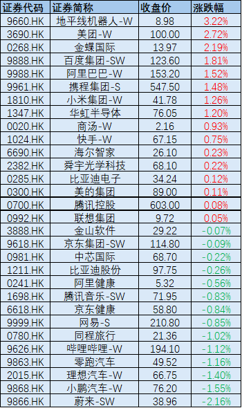 恒生科技指数成分股今日表现