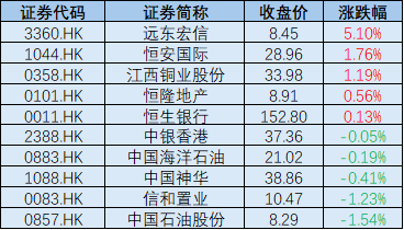 标普港股通低波红利指数前十大成分股今日表现