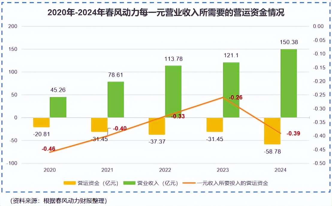 2020年-2024年,春风动力“一元收入所需要的营运资金”均为负数,说明公司仅靠占用上下游资金就能维持业务发展,并不需要另行投入更多的营运资金。