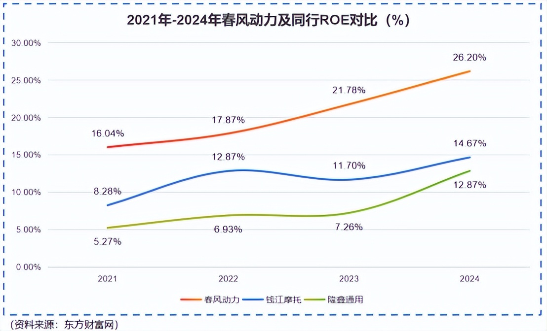 2021年-2024年,春风动力的ROE连年攀新高,2023年以后更是直接突破20%,成为整个制造业的佼佼者,将钱江摩托、隆鑫通用等同行远远甩在身后。