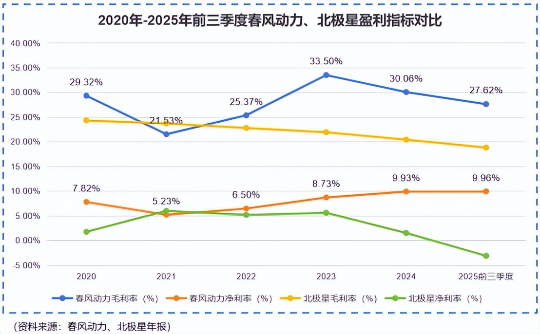 2025年前三季度,春风动力在毛利率依旧维持27.62%的正常水平下,将净利率提高到了9.96%,比“老大哥”北极星都会赚钱,这里最大的功劳无疑是其不断降低的销售费用率。