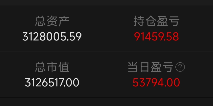 当前总资产312w,今日盈利5.3w,总仓位满仓,目前总盈利112w 。