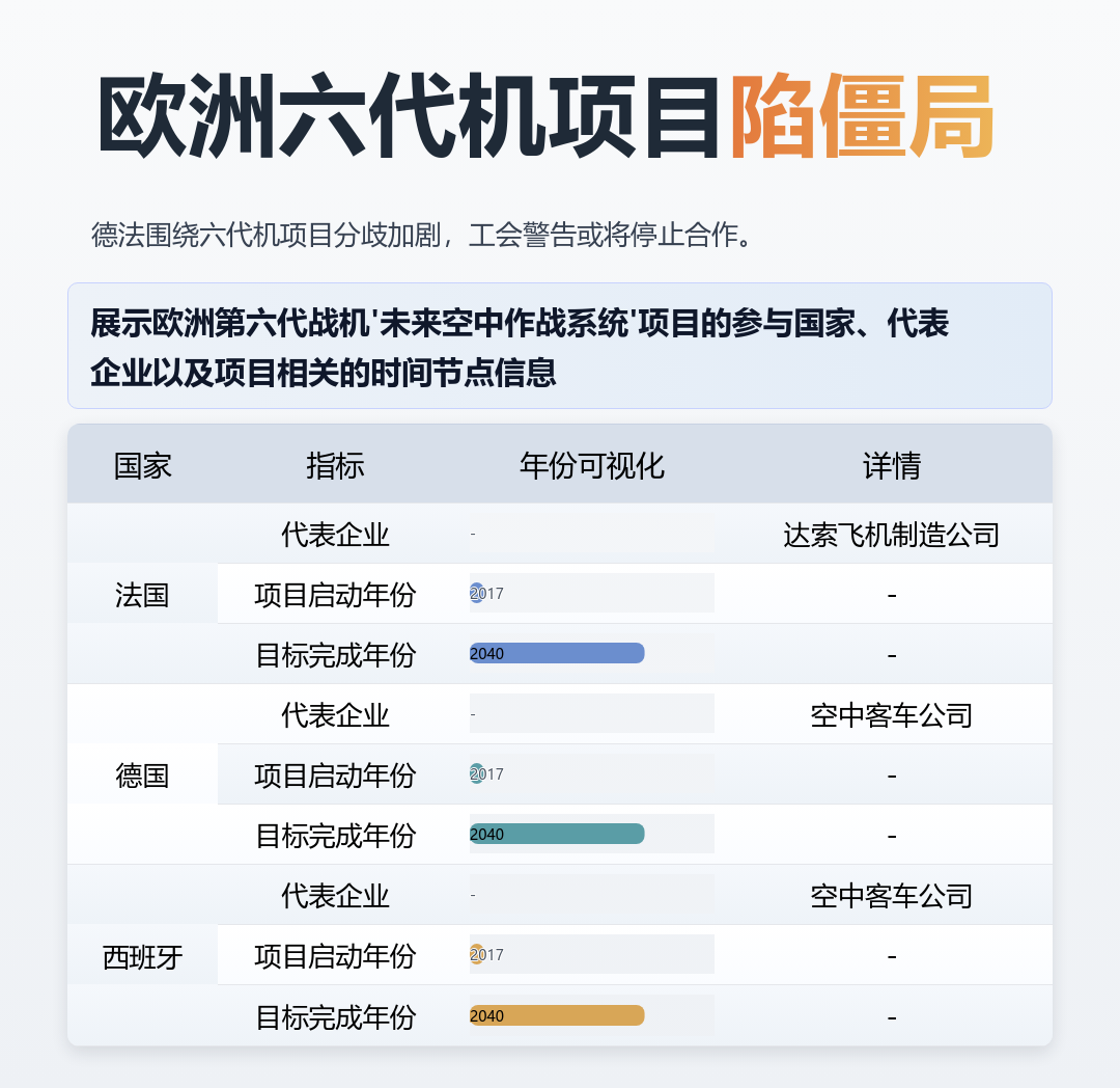 看看这个项目背景就知道为什么撕得这么凶:三国2017年启动的“未来空中作战系统”,要替代现役的阵风和台风战机,2040年就得交货。现在七年过去了,连领导权都没谈拢。