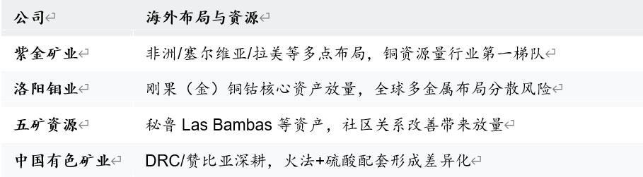 中资矿企在非洲与拉美展现较强的建设与治理能力,项目投产与达产速度快,对复杂矿体(深部、低品位、难选冶)形成工程+运营闭环能力优势。如在产量方面,紫金矿业和洛阳钼业均规划 2028 年实现产量相对2024年翻倍,是全球头部中少有能够大幅增产的企业。
