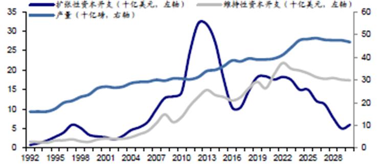 ·资本开支不足(一半左右还为维护性),导致新增产能有限。2010 – 2020 年全球资源类资本开支持续低迷,尽管 2020 年后有所回升,但新增产能释放滞后,预计供给高峰将出现在 2028年后,且增产幅度有限。