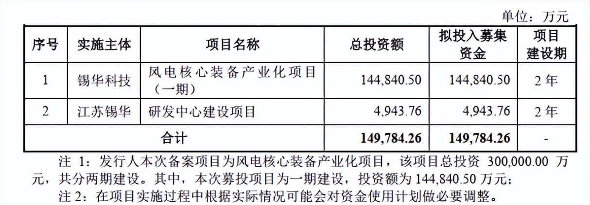 公司本次募投项目主要包括“风电核心装备研发中心及产业化项目(一期)”和“研发中心建设项目”。两者共计拟投入募集资金14.98亿元,从而扩充机械加工产能,并强化公司的研发能力和可持续发展能力。
