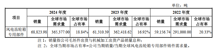 公司为全球行业领先的大型高端装备专用部件制造商。根据公司招股书披露,基于全球风能理事会、国家能源局、中国铸造协会、中国可再生能源学会风能专业委员会等机构数据,并结合行业专家访谈情况及市场调研构的统计数据测算:2022年度至2024年度,公司在风电齿轮箱专用部件的铸件细分领域全球市场占有率为20%左右。