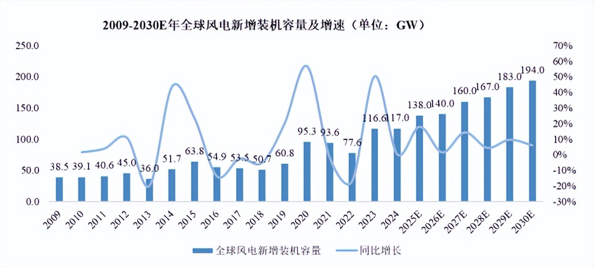 2018年以来,我国风电发展进入全面加速期,2024年新增装机容量79.34GW,创历史新高,并贡献了全球增量的大部分。在“碳中和”“碳达峰”的经济社会战略目标下,国内风电产业未来将保持良好的发展趋势。根据GWEC数据,2009-2024年全球风力发电新增装机容量波动上升,年复合增长率为7.69%。2024年,全球风力发电新增装机容量达到117GW,创下近十年来最高纪录。CWEC预测,2025年至2030年全球风电新增装机容量的复合年增长率为7.05%,2030年预计新增装机容量将增长至194GW。
