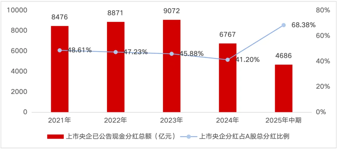 政策效果在上市央企的分红数据中得到直接体现。2025年中期,477家上市央企虽然数量仅占A股总量的8.7%,但累计公告现金分红达4686亿元,同比增长7%,占同期A股市场分红总额的比重超过68%。这不仅反映出央企分红规模的提升,也凸显其在A股整体分红结构中的重要地位与持续贡献。