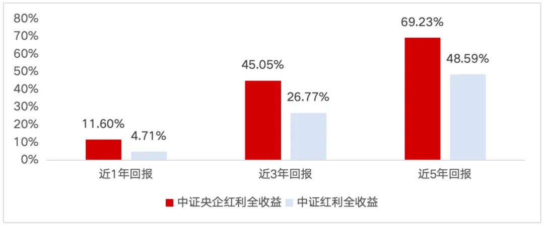 从中长期维度看,无论是近一年、近三年还是近五年,计入分红再投资的中证央企红利全收益指数相较中证红利全收益指数都更为出彩。