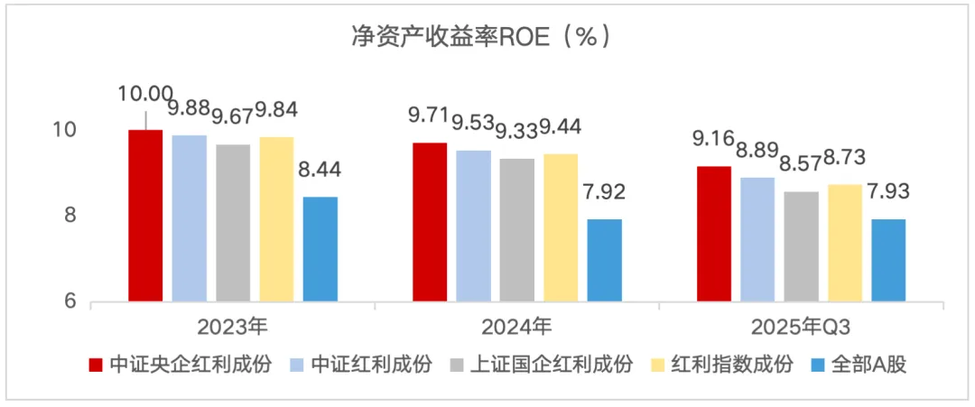 数据显示,2023年至2025年三季度,央企红利指数成份股的平均净资产收益率(ROE)与净利润水平,持续高于A股整体与部分主流红利类指数,盈利状况的持续改善,有望为可持续的经营与股东回报带来“源头活水”。