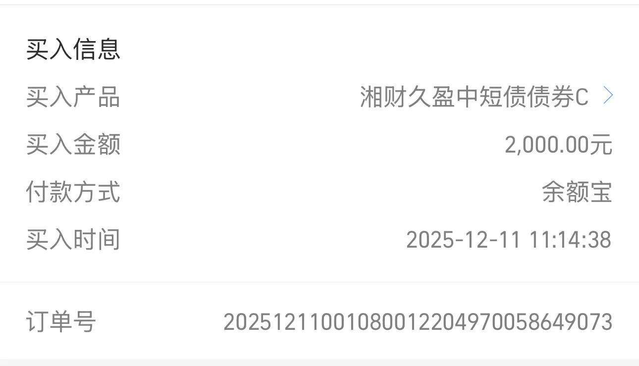$湘财久盈中短债C(OTCFUND|010811)$+2000元、湘财久盈中短债债券C+2000元、近期一诺慢慢布局稳健债券了,中短债波动也很低,行情震荡对它影响也不会很大,湘财久盈就是一支稳健的中短债,昨天也是稳稳收了2个蛋,连续上涨了4天、近一年上涨197个蛋也是远超银行理财,关键它还比较灵活,持有7天就能免手续费用、一诺现在是追求稳的同时尽量做到收益最大化、也是远比我放在余额宝强上不少,余额宝一年也就1%左右、这个远超它两倍呢、主要还是闲钱太多放在余额宝又觉得收益太低,所以一诺还是选择放在稳健中短债里面,稳健的同时还能收益最大化呢,湘财久盈持仓以92.025信用债为主,这部分可以享受到节假日的票息,仅搭配6.85%利率债用来平衡收益、整体抗跌能力真的非常不错呢,持有也会让人比较安心,年底了一诺继续加大稳健仓位比例。