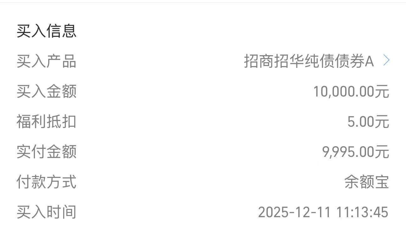 $招商招华纯债A(OTCFUND|003448)$10000元、招商招华纯债债券A+10000元、招商的财富号里面有菜包、刚好领了核销一下,招商招华是一支纯债基金,近期债券也是慢慢回暖了,加上昨晚降息利好加持下,年底了债券应该会有一波行情,一诺年底还是图稳为主哈,从最新持仓来看,主要以99.87%信用债为主,这部分也可以稳稳吃到节假日的票息,在搭配6.62%利率债用来递增收益,整体布局非常的稳健,主要还是以信用债稳健底仓为主,少量利率债做增厚收益,行情好的时候产蛋能力能跟上,昨日信用债表现不错,招华也是稳稳收了4个蛋,近一年也是上涨2.23%,灵活的同时收益也是远超银行理财和货币基金,长期持有也比较安心,今天债券持续回暖了,晚上可以吃上肉肉,今日一诺领菜包继续大额加仓稳健基金。