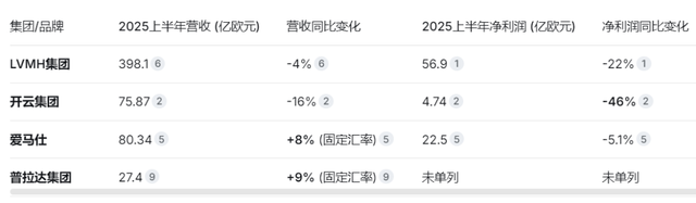 2025年上半年,LVMH集团营收下降4%、净利润降超2成;开云集团上半年净利润大幅下挫46%;爱马仕的净利润也出现了下跌。香奈儿是非上市公司,未发布2025年数据,但2024年销售额同比下降了5%。