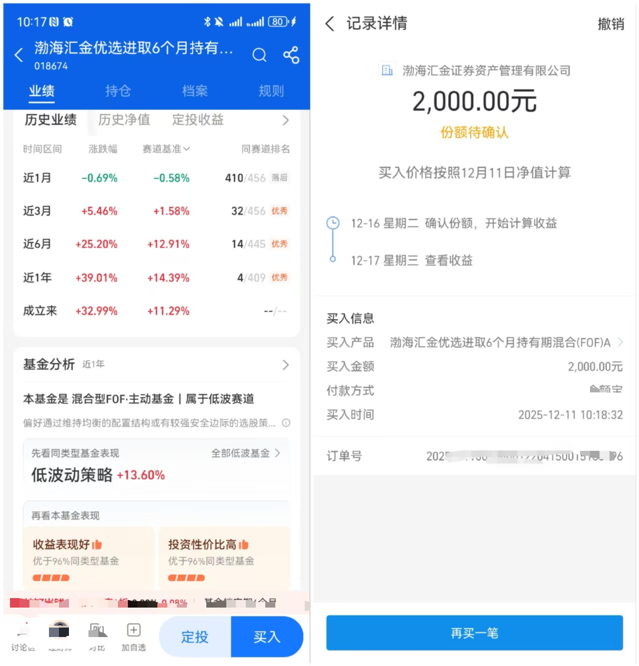 在市场经历一段时间的调整后,我看到市场情绪上有修复迹象。此时,我考虑更多的是如何以更稳健的方式参与这轮可能的反弹,而不是去压某个单一赛道的上涨。今天我继续布局2000元$渤海汇金优选进取6个月持有混合发起(FOF)A(OTCFUND|018674)$,前几天我建仓观望了一下,表现还不错。