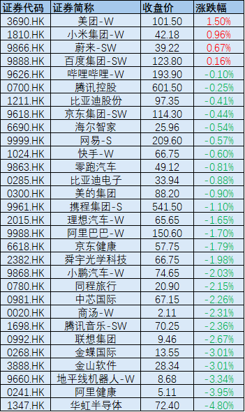 恒生科技指数成分股今日表现