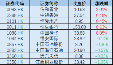 标普港股通低波红利指数前十大成分股今日表现