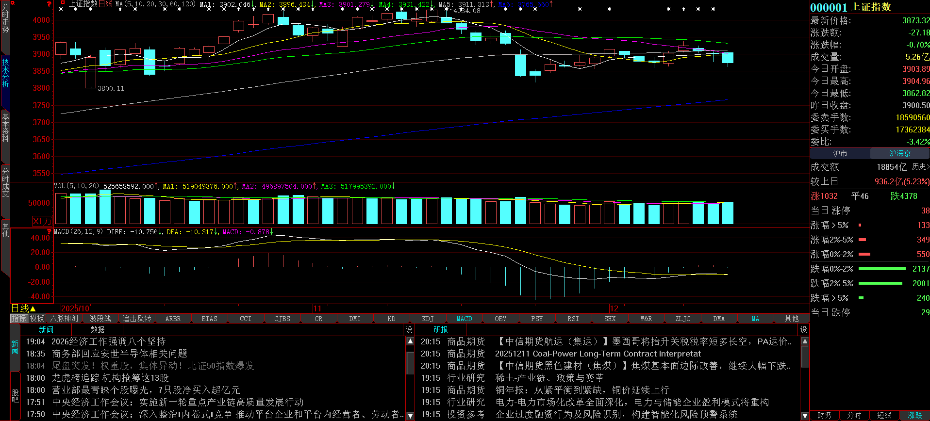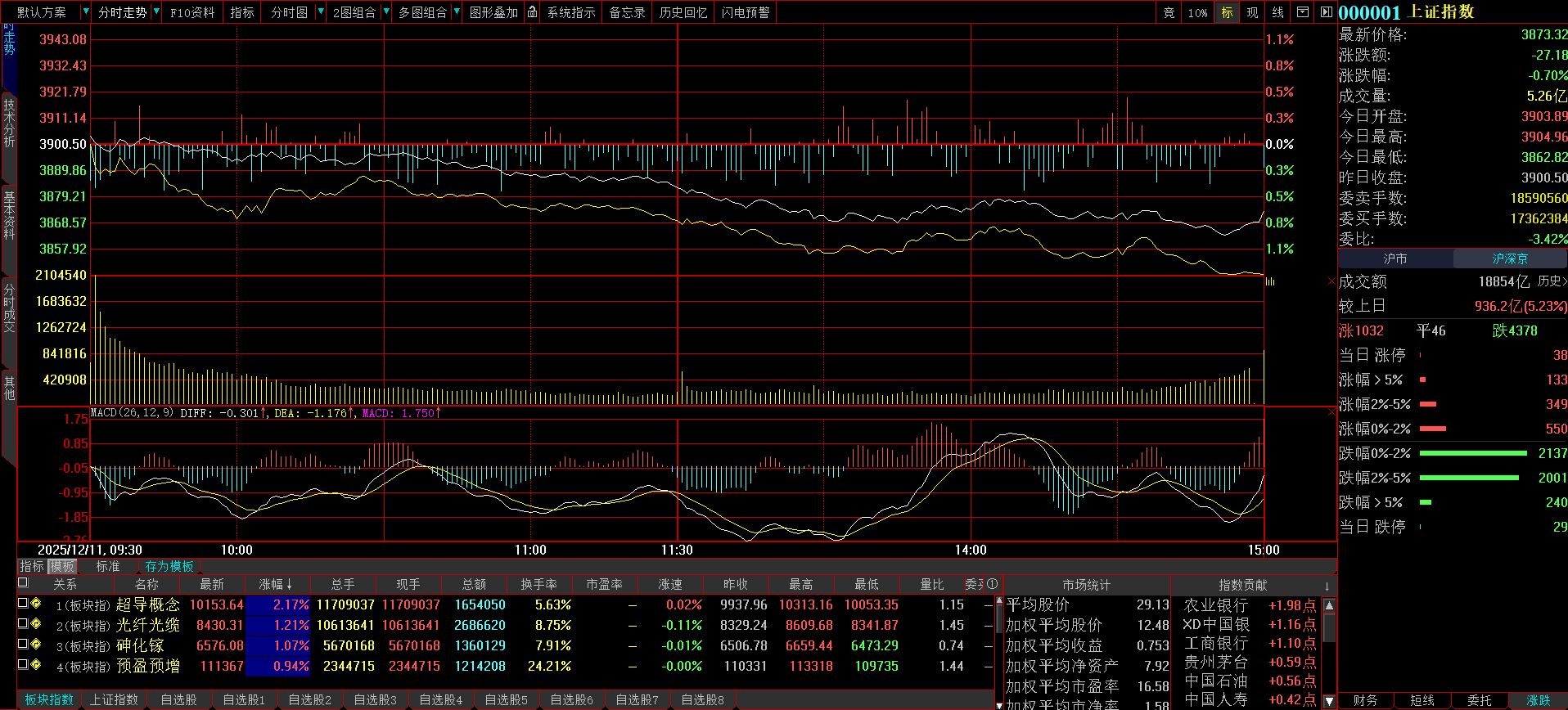 继周一放量上涨、周二周三连续两量缩量下跌后,原本还期待能否像上周一样,重演周一放量涨、周二三四缩量回调周五再放量涨的剧本。然而,12月11日,周四,沪深主要指数仅象征性微幅高开,即持续震荡下行,盘中象样的反弹很少且力度不大,午后更是加速下行,越跌越深,至收盘,沪指收于3873.32点,跌0.7%,深成指跌1.27%,创业板跌1.41%,科创综指跌1.295。市场个股涨少跌多,上涨1000多家,下跌又是接近4400家,市场平均股价下跌1.04%。全市场全天成交额1.885万亿元,较前一日放量930多亿元。
