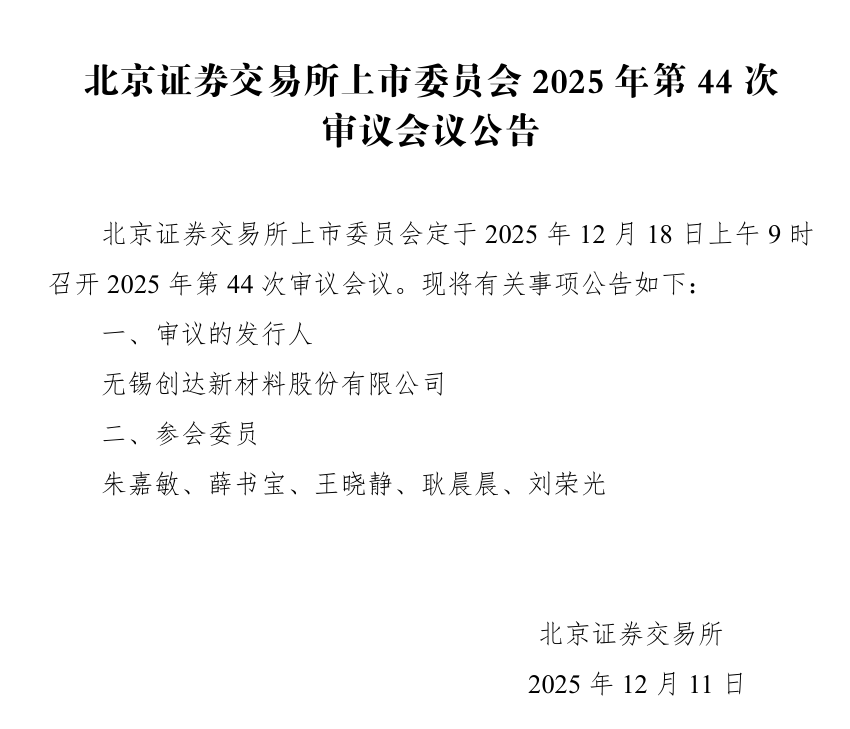 北交所上市委会议继续,创达新材将于12月18日上会审议,紧锣密鼓啊。