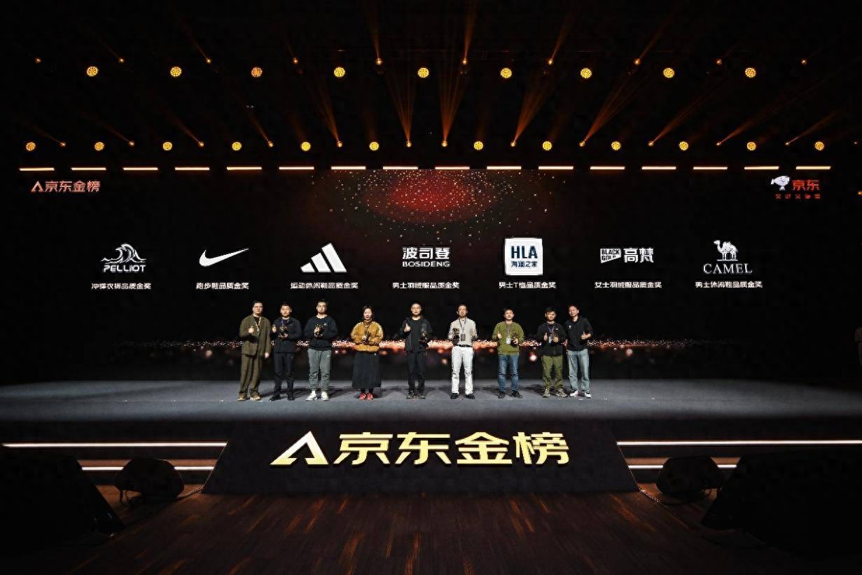 【大力财经】12月9日,2025京东金榜盛典于上海举行,正式揭晓2025年度获奖榜单。活动现场,京东JD FASHION多款产品斩获重磅奖项,伯希和冲锋衣裤、耐克跑步鞋、阿迪达斯运动休闲鞋、波司登男士羽绒服、海澜之家男士T恤、高梵女士羽绒服、骆驼男士休闲鞋荣获“年度品质金奖”,李宁运动羽绒服与安踏跑步鞋摘得“新品金奖”。
