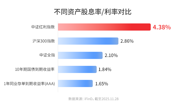 在市场利率中枢下行的趋势下,分红稳定性和增长潜力成为投资的重要考量因素。截至十一月底,中证红利指数股息率为4.38%,显著高于其他资产。