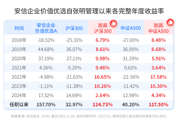 $安信企业价值优选混合A(OTCFUND|004393)$自张明管理以来,累计收益达157.70%,历史连续7个完整年度跑赢沪深300指数、中证A500指数,或是把握A股及港股红利机会的有力抓手。