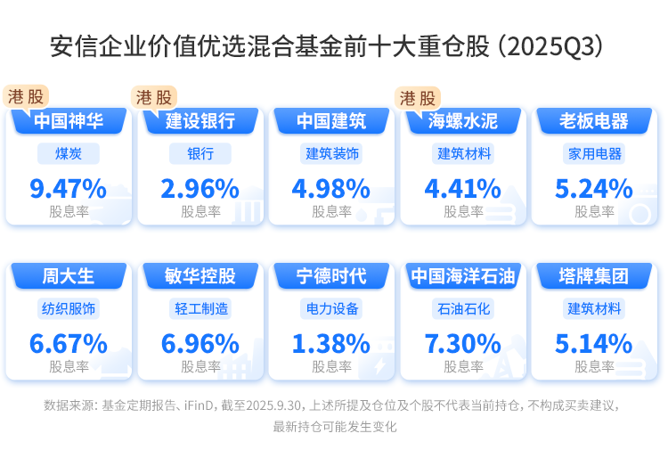 从主动管理的角度,可关注那些注重企业基本面、在红利板块中深耕细作的基金产品。以$安信企业价值优选混合A(OTCFUND|004393)$为例,基金经理张明采取自下而上的选股策略,聚焦商业模式清晰、竞争优势明显、估值合理的公司,重点配置银行、建筑材料、煤炭、石油石化等低估值、高股息行业。