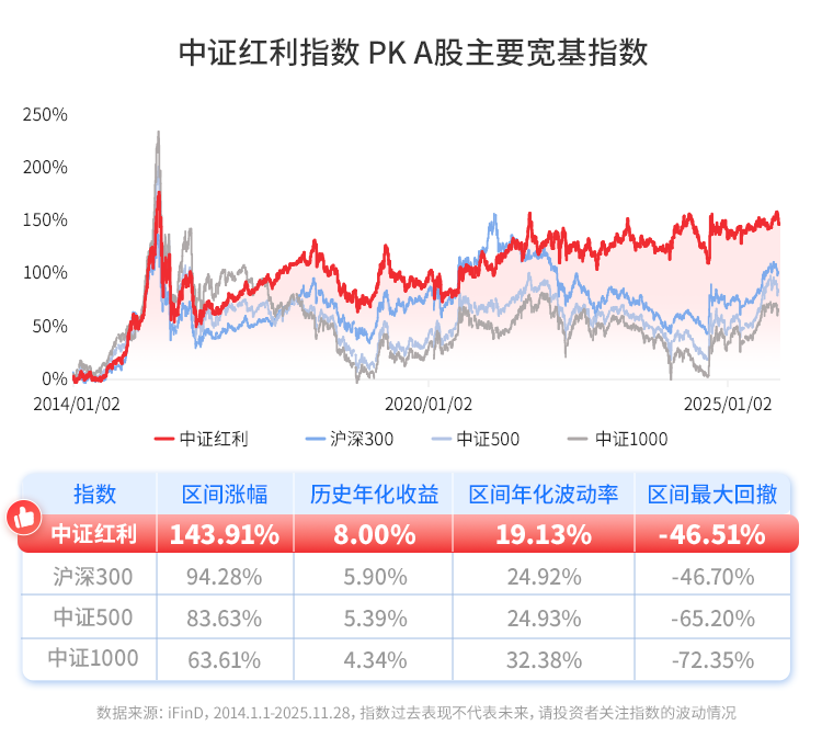 自2014年以来,中证红利指数累计涨幅达143.91%,在收益、波动等维度均展现出优于市场主流宽基的显著优势。