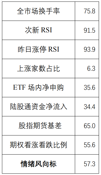 2、我们使用市场换手率、次新股相对强弱指数、昨日涨停个股相对强弱指数、市场上涨家数占比、ETF场内净申购金额、陆股通资金净流入、股指期货近远月基差、看涨期权和看跌期权持仓量之比等八个指标来构建A股市场情绪风向标。我们使用每个指标在其历史上所占的百分位数作为打分,然后等权加总获得市场整体情绪分数。由于采用百分位打分,因此整体情绪分数的区间范围为0至100分,分数越高代表情绪越高。