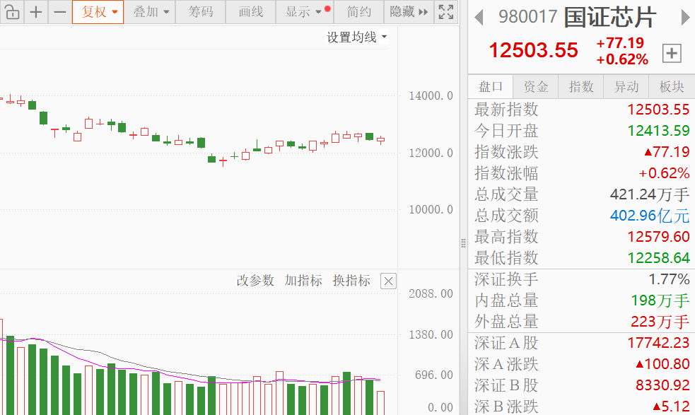 成交量12372亿,比昨天增加800亿、约6.91%,全天预估量能可能在1.9万亿下方,放量强势站上2万亿之前,还是要警惕行情反复和重走地量地价。