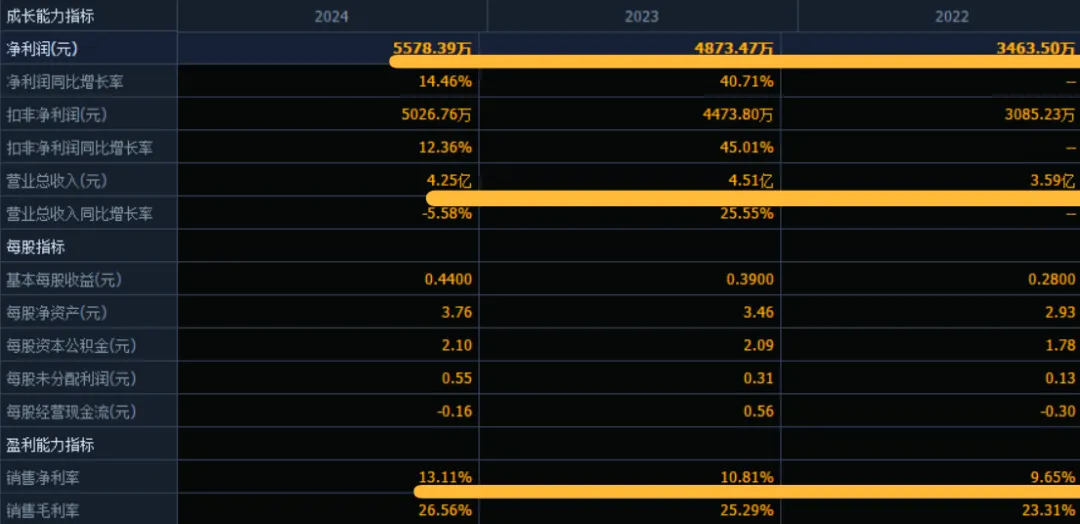公司 2022-2024年分别实现营业收入3.59万元/4.51亿元/4.25亿元,增长率依次为-%/25.55%/-5.58%;实现归母净利润0.35亿元/0.49亿元/0.56亿元,增长率依次为-%/40.71%/14.46%。