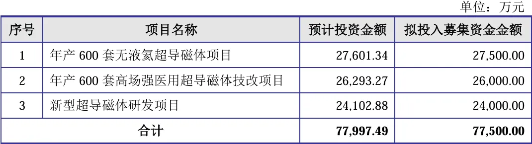 项目总投资资金7.75亿,其中2.75亿用于年产600套无液氦超导磁体项目,2.6亿用于年产600套高场强医用超导磁体技改项目,2.4亿用于新型超导磁体研发项目,具体项目如下: