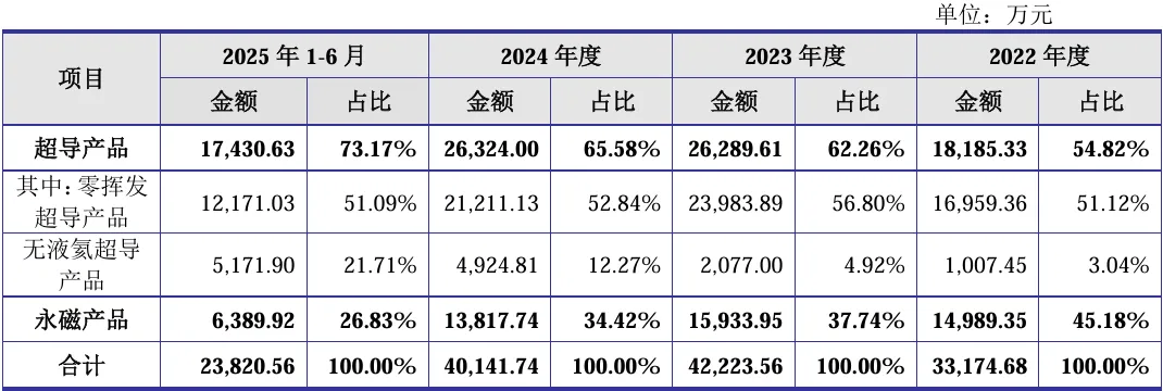 2025H1,公司主营业务收入按产品类别可分为两大板块,分别为超导产品(1.74亿元,2025H1 主营收入的 73.17%)、永磁产品(0.64亿元,占2025H1主营收入的 26.83%)。2022年至 2025H1,超导产品始终为公司的核心产品及主要收入来源,收入占比稳定在50%以上、且呈逐年增长的态势;而在超导产品当中,又以零挥发超导产品为主体。