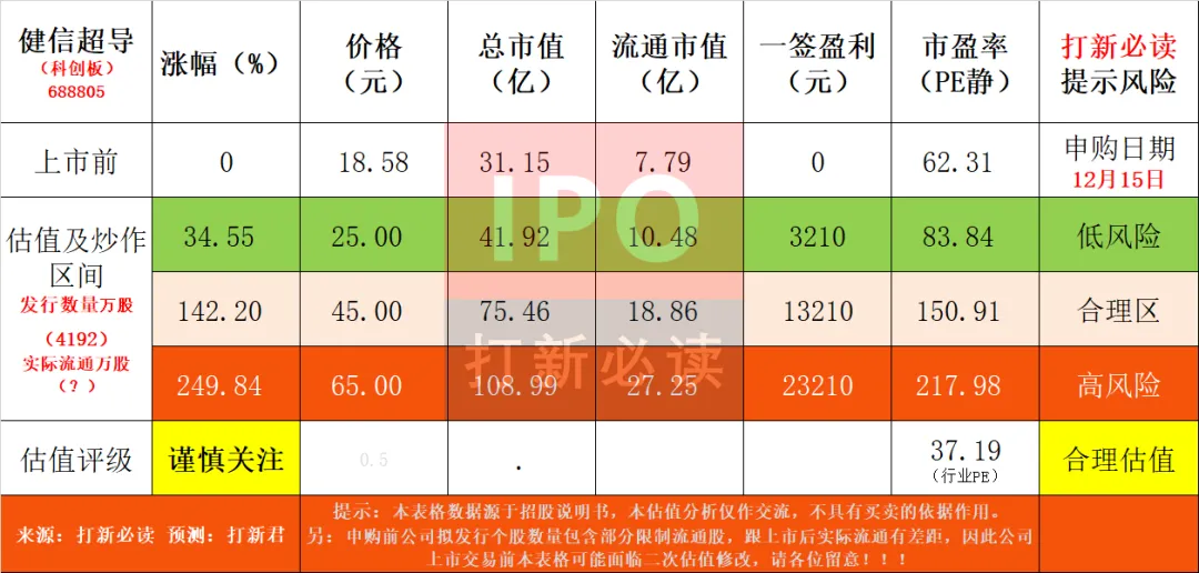 【提示说明】:本表格数据源于招股说明书,申购前公司拟发行个股数量包含部分限制流通股,跟上市后实际流通有差距,因此公司上市交易前本表格可能面临二次估值修改,请各位留意!!!$健信超导(SH688805)$