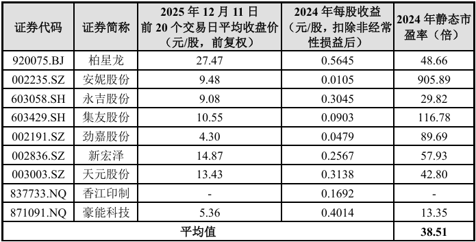 8. 可比公司有柏星龙、安妮股份、永吉股份、集友股份、劲嘉股份、新宏泽、天元股份香江印刷和豪能科技,平均市盈率38.51倍(其中北交公司柏星龙的市盈率是48.66倍)。