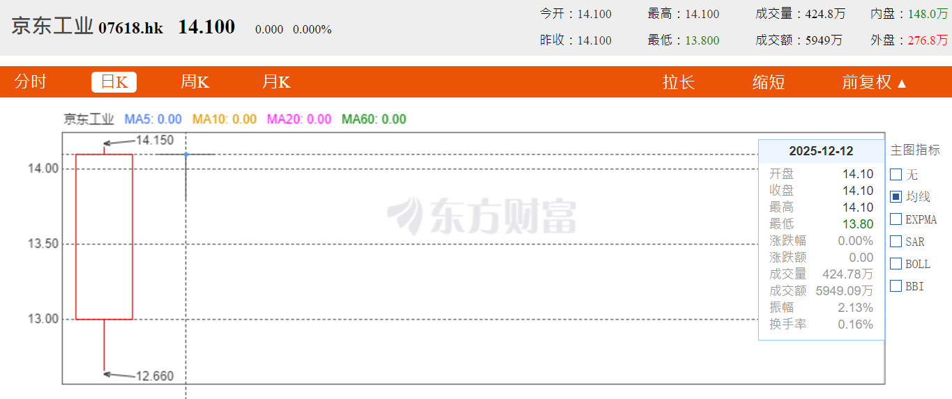 12月12日更微妙,京东工业开盘下探后继续收平,股价在14.10港元稳如。但这一天成交额急剧缩水,跌至5949万港元。