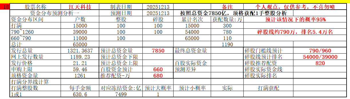 根据综合分析,目前预测江天科技的申购资金总量为7850亿左右。测算的结果见附图。个人观点,百股需要资金660万元,建议680万每百股配资;碎股计算难度大,风险高,测算后,个人观点是在大概率顶格申购1+1的情况下,碎股线为790万(从数学模型推算应该是760万,由于每次都卷提高了一点),排名为5.4万名,推荐按照820万配资。资金预测7850亿,相比南特,顶格降低会影响200亿,门槛提高很多会影响800亿,这样在8676减少1000亿附近,由于最近大鹏的影响力会增加一些新的资金200-300亿。相比精创,门槛提高减少300亿左右,顶格提高会增加700亿,加上新增资金,所以个人觉得在7700-8000亿之间。由于本轮会并户,所以预计786万以上的资金户数会从上轮的5.3万会减少到5万户,预计本次门槛以上的有6.5万户,这样碎股大概有5.4万户,若从数学模型计算应该在760万附近,但碎股线是卡排位的,总是会卷上去一些,认为在790万附近。推荐配资820万。个人认为本轮最优的配置是1+1,但若顶格实力的大多这么认为,形成一致的预期,就不愿意打顶格,那么这轮总资金就有可能低于7499的分界线,这样顶格就2+1了,若是这样,碎股数量将降低到3.9万户,碎股线会提高到960-980万。有实力的还是需要多加,增加安全系数,我们需要安全上岸,而不是精准踩线!资金实力不允许的,在分界线附近的,自己尽力了就好!现在很卷,没有绝对的安全,只有概率高低,预测翻车也是正常的。不喜勿喷,口下留德,谢谢! 另外,本人在论坛原则上不帮忙分户或指导分户,很抱歉!