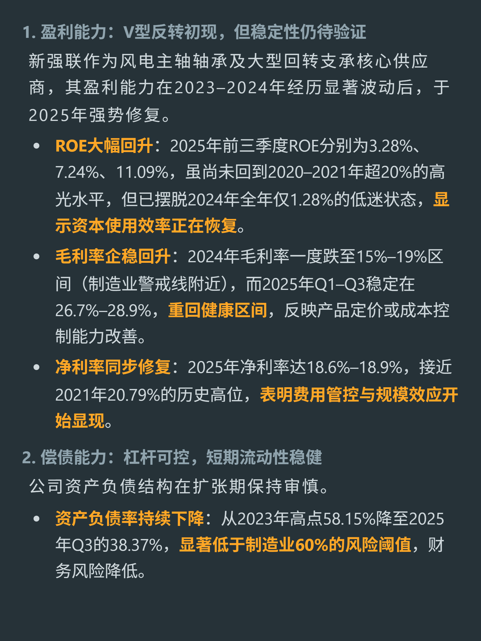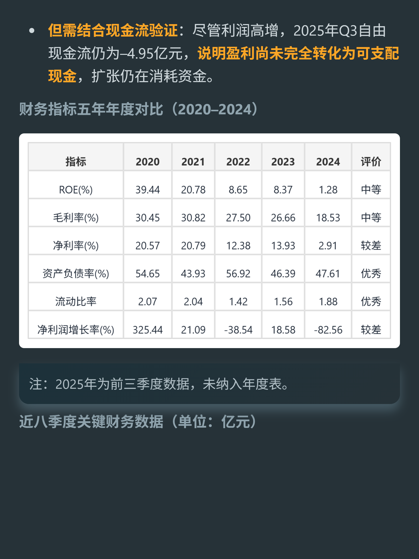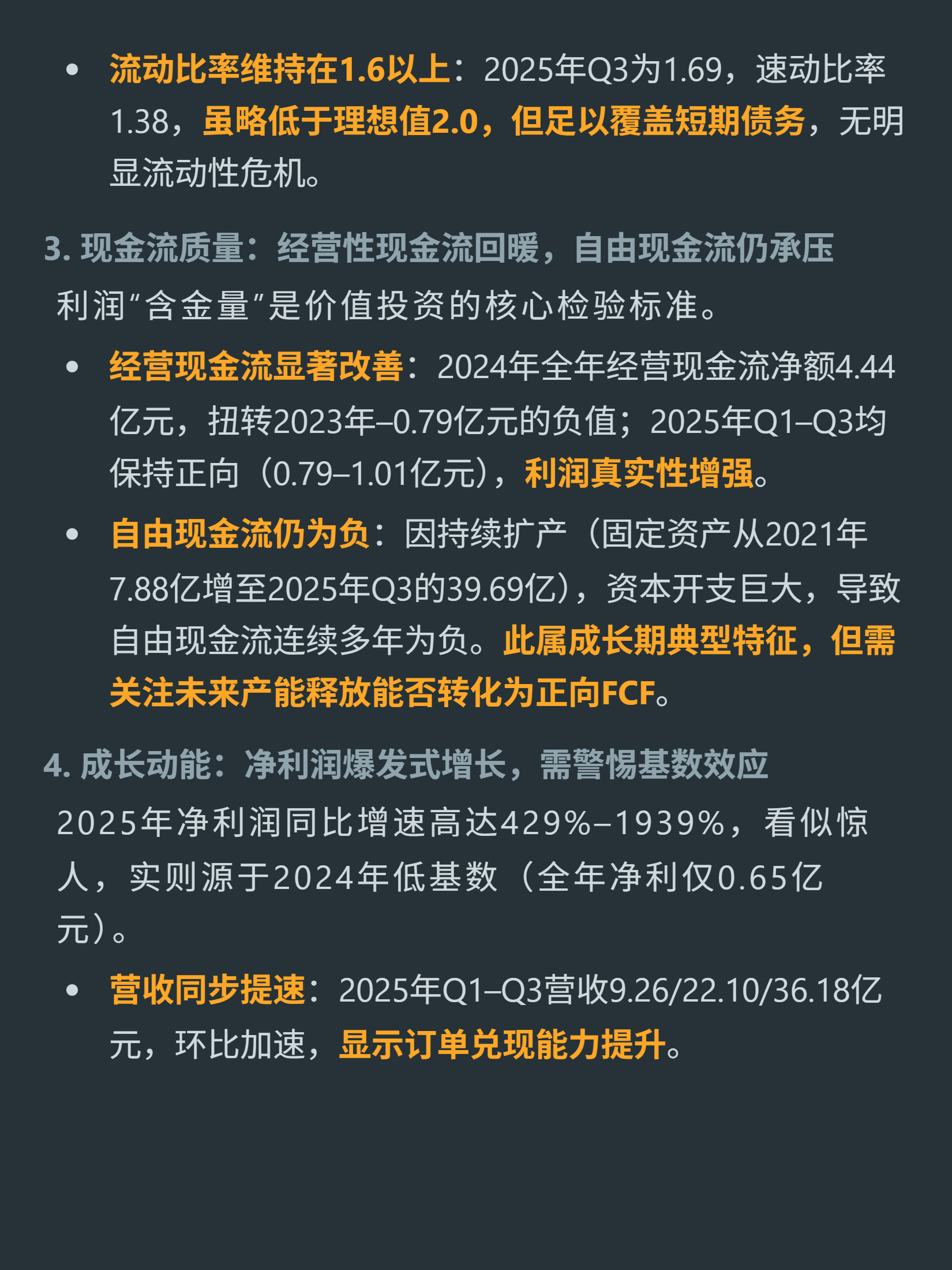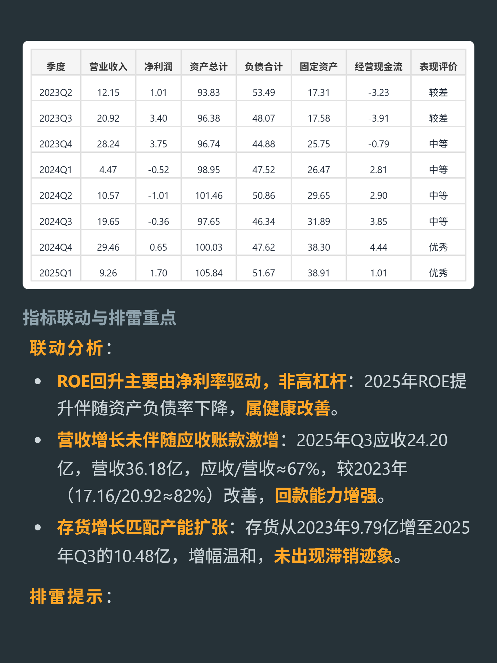 财务亮点:2025年盈利修复,前三季度ROE11.09%(2024年1.28%)、毛利率28.5%(2024年18.53%)、净利率18.6%-18.9%(2024年2.91%);营收环比加速(Q1-Q39.26/22.10/36.18亿元),经营现金流转正;但自由现金流因扩产仍负(2025年Q3-4.95亿元),2025年净利润高增源于2024年低基数(净利0.65亿)。