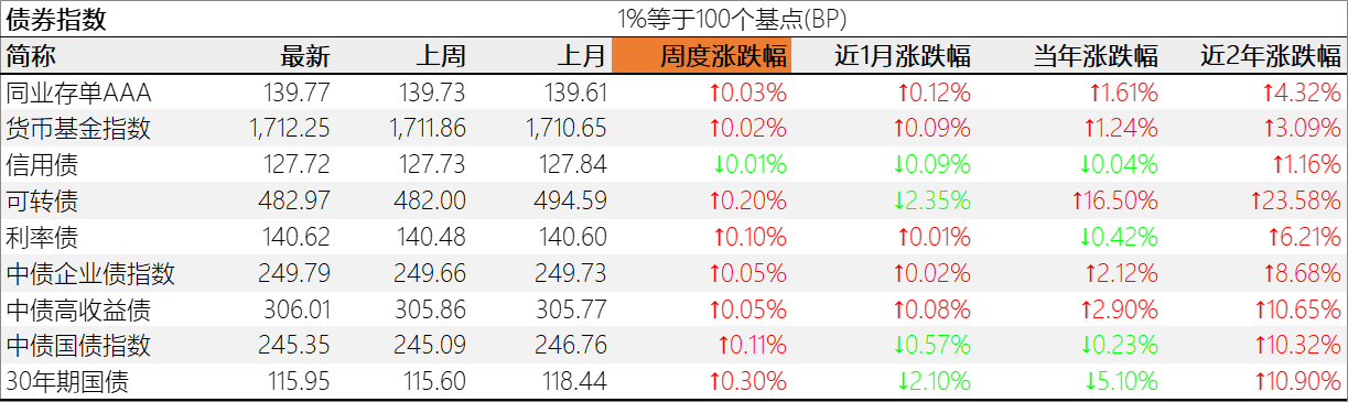 主要债券品种以涨为主,表现最好的是30年期国债,表现欠佳的是信用债。