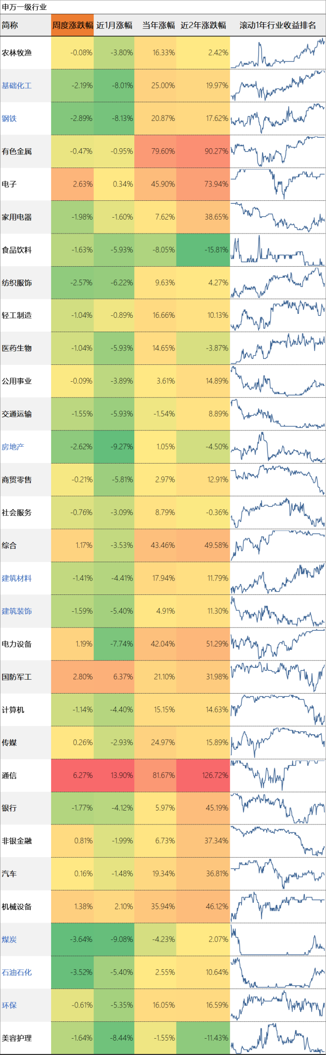 本周行业涨幅靠前的是通信6.27%、国防军工2.80%,跌幅靠前的是煤炭-3.64%、石油石化-3.52%。