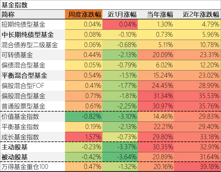 主要基金类型中,本周表现较好的是偏股混合型基金,平均收益0.71%;表现靠后的是短期纯债型基金,平均收益0.04%;价值、平衡和成长型基金,本周表现较好的是成长基金,平均收益1.57%;本周主动股基跑赢被动股基。基金重仓100指数本周上涨0.47%。
